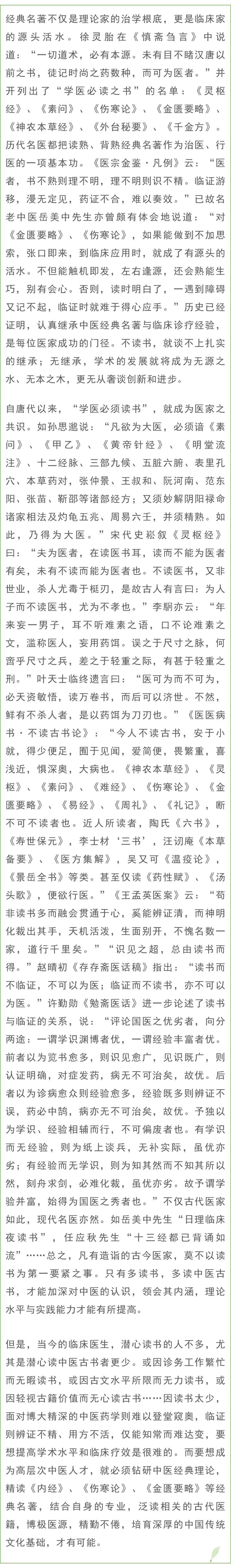 “读万卷书,行万里路,与天下名士游”,是古人对治学之道的高度总结。读书与实践,是人们获取知识的两大法门。历代医家在繁忙的诊务之余,笔耕不辍,为我们留下了大量的医学名著。这些文献既是历代医家智慧的结晶,亦是历代中医药学术经验的积淀和理论的升华。书籍是知识的载体,源远流长的中医药学术、根基深厚的中医药理论体系,蕴藏于历代医药典籍之中。博览群书,精研覃思,从中汲取前人的宝贵经验和学术精华,是造就自身良好学术素质的必由之路。